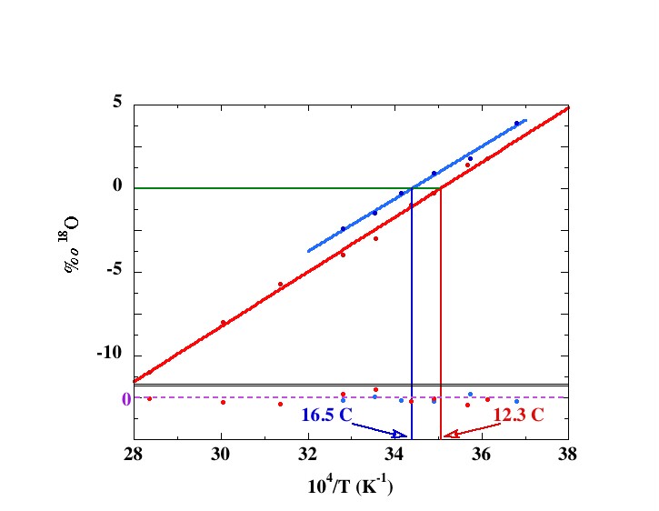 Синие и красные линии на графике ниже показывают его результаты (таблица X и график 5 в его статье). %o O-18 - это отклонение его экспериментальных образцов от его стандартной воды.