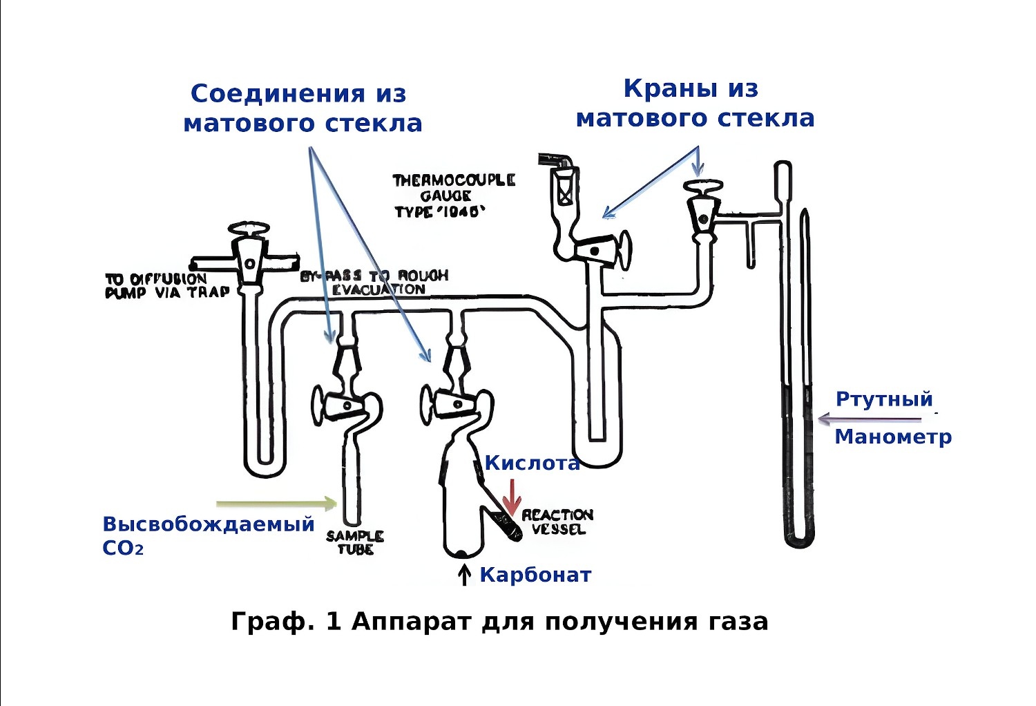График 1: Стеклянная система труб Дж. МакКрея для получения CO2 для анализа O-18.