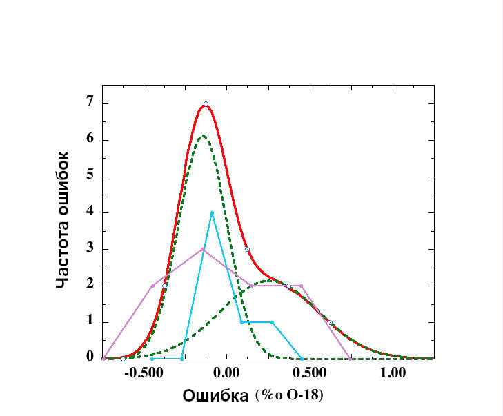 Далее, необходимо узнать, являются ли эти ошибки систематическими или случайными. Случайные ошибки уменьшаются по формуле \(1/\sqrt{N}\), где N - число повторений анализа. Если ошибки случайны, то можно надеяться на очень точное измерение температуры, просто повторив определение dO-18 достаточное количество раз. Например, в работе МакКрея 25 повторений уменьшают среднюю ошибку в любой отдельной температуре на 1,3/5 => (+/-)0,26 C.