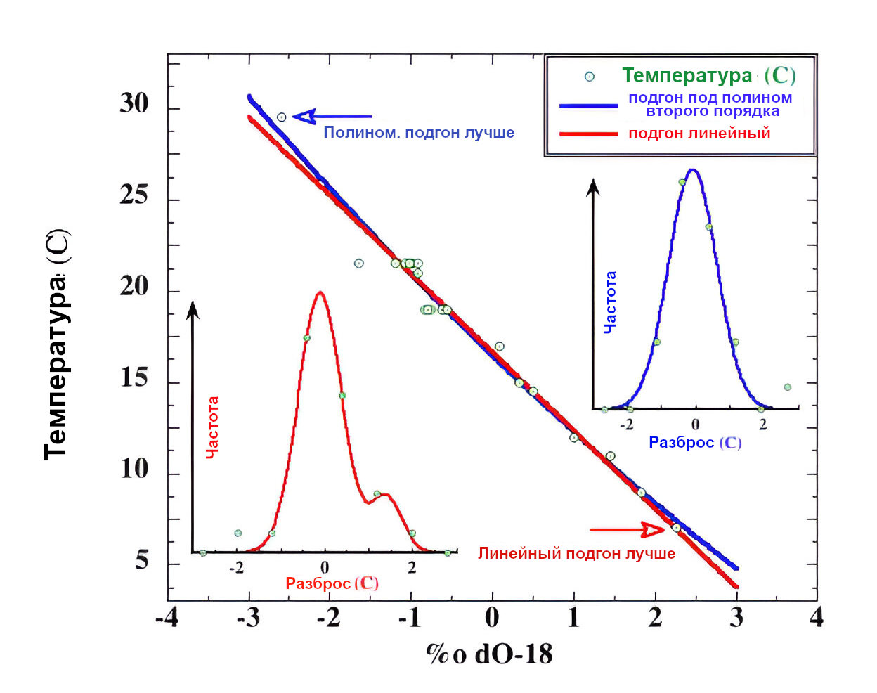 Ким и др. сообщили о меньшей аналитической ошибке (+/-)0,13, что эквивалентно неопределенности в T = (+/-)0,6 C. Но их (+/-)0,13 - это аналитическая точность масс-спектрометрического определения фракций O-18. Это не общий экспериментальный разброс. Остаточный разброс точек (разброс отклонений) является лучшей метрикой неопределенности, потому что уравнение Ким и др. представляет собой соответствие (подгонку) всем экспериментальным данным, а не только фракциям O-18, найденным масс-спектрометром.