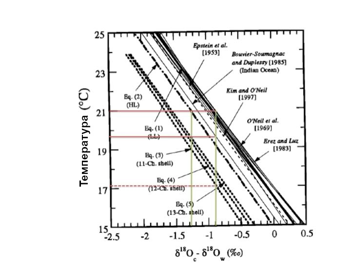 Горизонтальная зеленая линия при %o O18 = ноль пересекает линии Флориды и Кейп-Кода при различных температурах, представленных вертикальными нисходящими к оси абсцисс. Они показывают, что один и тот же dO-18 дает разницу в 4 C, в зависимости от того, какое уравнение вы выберете, при этом очевидно T коварирует с изменением солености на 0,045%o (36,7%o во Флориде, 32,2%o в Кейп Коде)