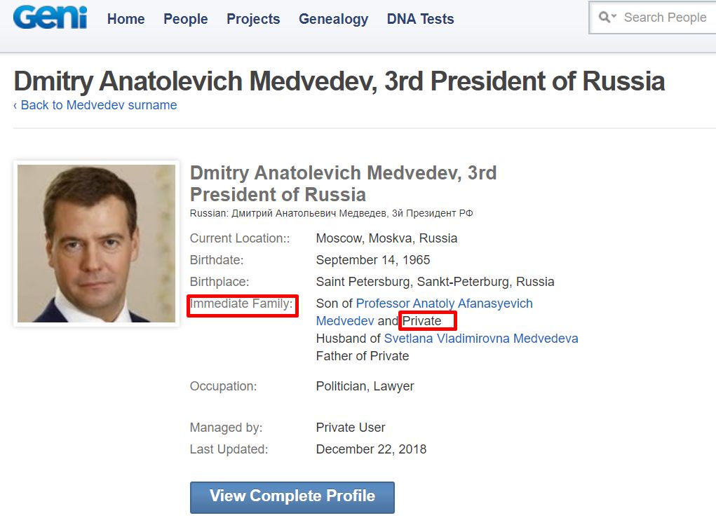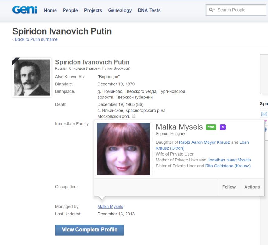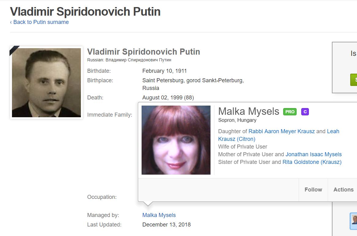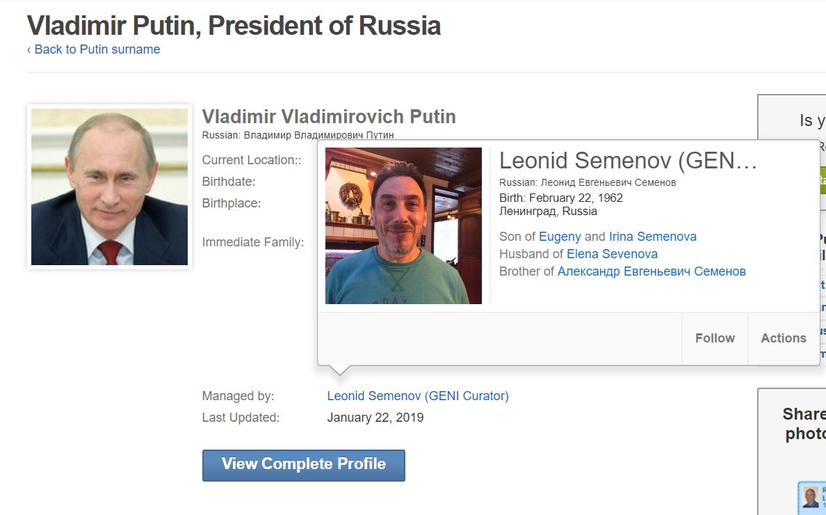 Интересный факт: есть такой всемирно известный сайт для отслеживания родословных - Geni.com У родословных / профилей людей есть кураторы. Родословная самого Путина курируется (Managed by) бывшим агентом КГБ Леонидом Семёновым - Geni.com.