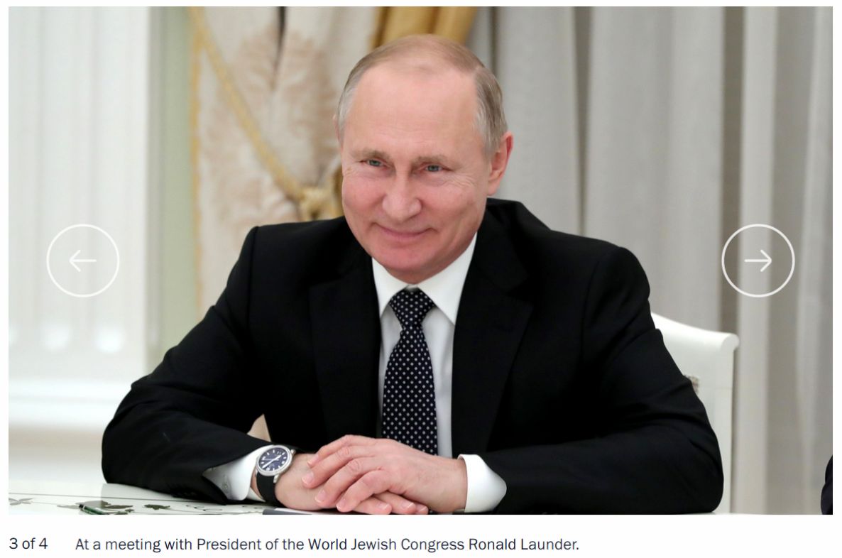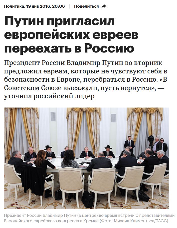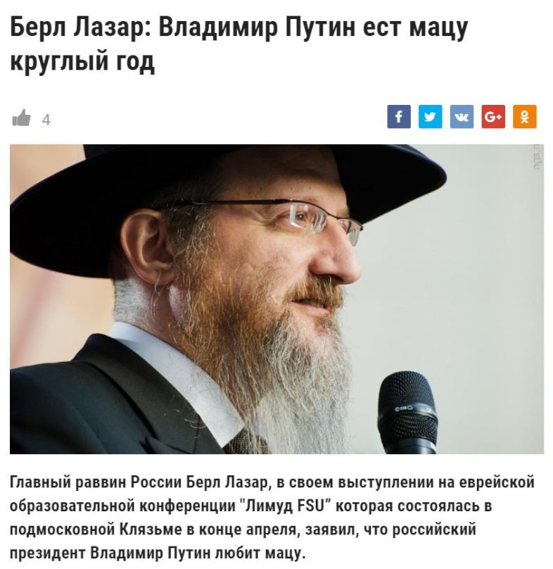 “Президент России Владимир Путин рассказал мне личную историю. Когда он был ребёнком, он рос в очень бедной семье. Его родители всегда были на работе. На его счастье, соседями по коммунальной квартире была семья жидов хасидов. И они всегда не забывали приглашать его к себе. Они были чрезвычайно добры к нему. И он понял не только, что они были добры к чужому ребёнку, не только, что они были добры к ребёнку, который не был жидом, но и то, что они были добры к ребёнку в то время и месте, когда делать это было опасно. 30 лет спустя из-за чувства благодарности, которое он испытывал по отношению к этой семье и уважения к жидовскому народу в общем, будучи заместителем мэра города Ленинград, он выдал официальное разрешение на открытие первой Жидовской школы в городе.” - слова на видео ниже с 1:33 по 2:37