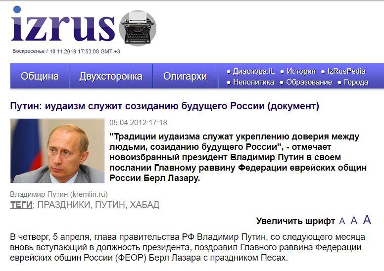 2012 Путин-Шаломов: "иудаизм служит созиданию будущего России" - архив статьи