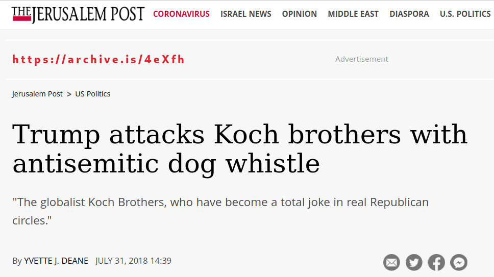 Президент США Дональд Трамп использовал антисемитское ругательство для атаки на Чарльза Дж. Коха и Давида Х. Коха, братьев (жидов) мегадоноров Республиканской партии, в посте в Твиттере во вторник.