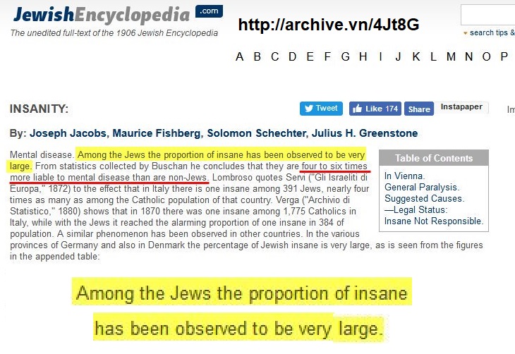 Психическое заболевание. Среди жидов наблюдается очень большая доля психически невменяемых/безумцев. Из статистических данных, собранных Бушаном, он делает вывод, что у жидов психические заболевания наблюдаются от 4 до 6 раз чаще чем у нежидов. Ломброзо цитирует Серви ("Gli Israeliti di Europa" 1872), который отмечает, что в Италии проживает один безумец на 391 жида, что почти в 4 раза больше, чем среди католического населения этой страны. Верга ("Archivio di Statistico." 1880) показывает, что в 1870 на 1775 католиков в Италии приходился один безумец, тогда как доля безумных среди жидов достигла тревожного значения в одного безумного на 384 жида. Похожий феномен наблюбался в других странах. В различных провинциях Германии, а также в Дании процент безумных жидов очень высок, что видно на цифрах из приложенной таблицы: