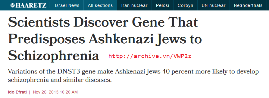 Вариации гена DNST3 делают жидов ашкеназов на 40% более предрасположенными к развитию у них шизофрении и подобных заболеваний.