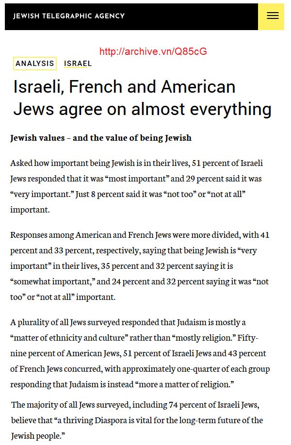 Три проведённых недавно Американским Жидовским Комитетом опросов жидов из США, Израиля и Франции показали, что того, что объединяет жидовские диаспоры и жидовское сообщество Израиля, больше, чем того, что их разъединяет.