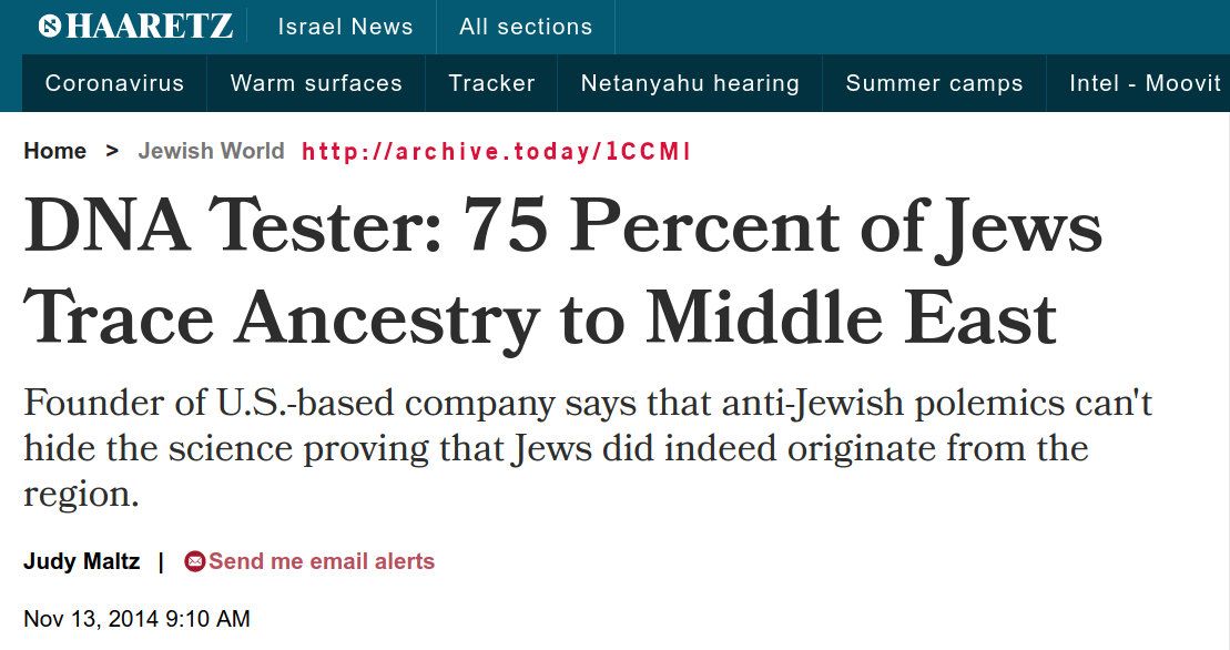 СкриншотТестер ДНК: у 75 процентов жидов прослеживается происхождение с Ближнего Востока