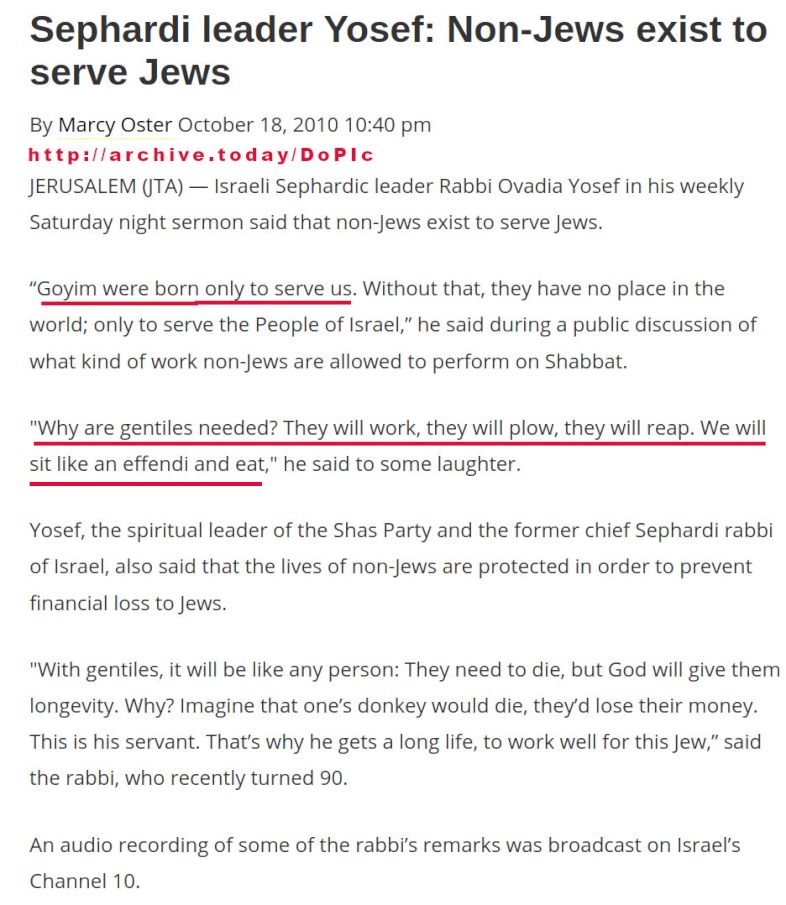 Йосеф, духовный лидер Партии Шас (Shas Party) и бывший главный раввин сефард Израиля, также сказал, что жизни нежидов защищены ради того, чтобы предотвратить финансовые потери жидов.