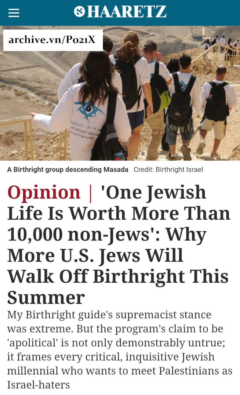 Позиция превосходства моего гида из программы Birthright (Birthright, дословно - право рождения, - образовательная программа для всех жидов в мире в возрасте от 18 до 32 лет, для которых организуются бесплатные десятидневные туры по Израилю. Жиды из России также ездят в Израиль по этой программе - сайт программы на русском языке) была максимальной. Однако утверждение о том, что программа является "аполитичной", является не только демонстративно ложным; в её рамках любого критически настроенного, любознательного жида миллениала (миллениал - человек, родившийся с 1981 по 2000 годы), который хочет встретиться с палестинцами, выставляют как ненавистника Израиля.