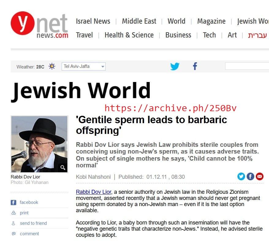 Раввин Дов Лиор, главный авторитет по жидовскому закону в движении Религиозный Сионизм, заявил недавно, что жидовка не должна никогда проводить зачатие спермой от донора нежида - даже если это последний из возможных вариантов.