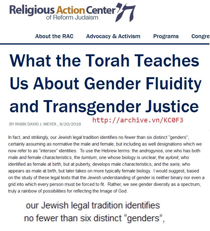 Фактически, и это поразительно, наша жидовская правовая традиция различает не менее шести отдельных "гендерных полов", определённо подразумевая как норму мужской и женский полы, но включая также определения, которые сейчас относятся к "межполовым" идентичностям. Используя жидовские термины: андроген - тот, у кого наличествуют как мужские, так и женские анатомические признаки, тумтум - тот, чья биология неясна, айлонит - тот, кто идентифицирован как женщина при рождении, но во время пубертатного периода развивает мужские признаки, и сарис - тот, кто выглядит как мужчина при рождении, но позже развивает биологические признаки более типичные для женщины. Я бы сказал, основываясь на исследовани этих правовых текстов, что жидовское понимание гендера не бинарно, и даже не жёстко разделено, когда каждый человек должен укладываться в какие-то рамки. Скорее, мы видим половое разнообразие как спектр, настоящую радугу возможностей, отражающую Образ Бога(Яхве).