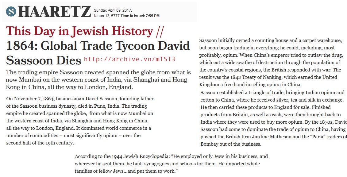 СкриншотЕщё добавлю: сыновья Давида Сассуна Артур Абрахам Давид Сассун и Фредерик Давид Сассун были основателями Банковской Корпорации Шанхая и Гонконга Honkong and Shanghai Banking Corporation (HSBC), через которую и отмывали опиумные деньги.