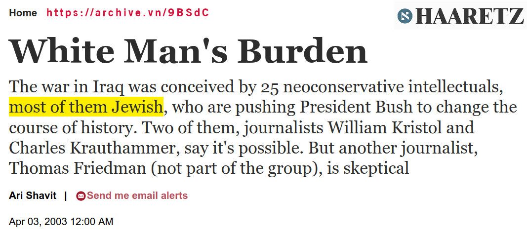 Война в Ираке была задумана 25 интеллектуалами неоконсерваторами, большинство из них жиды, которые толкают Джорджа Буша к изменению курса истории. Двое из них, журналисты Уильям Кристол и Чарльз Краутхэммер, говорят, что это возможно. Но другой журналист, Томас Фридман (не из числа этой группы) настроен скептически.